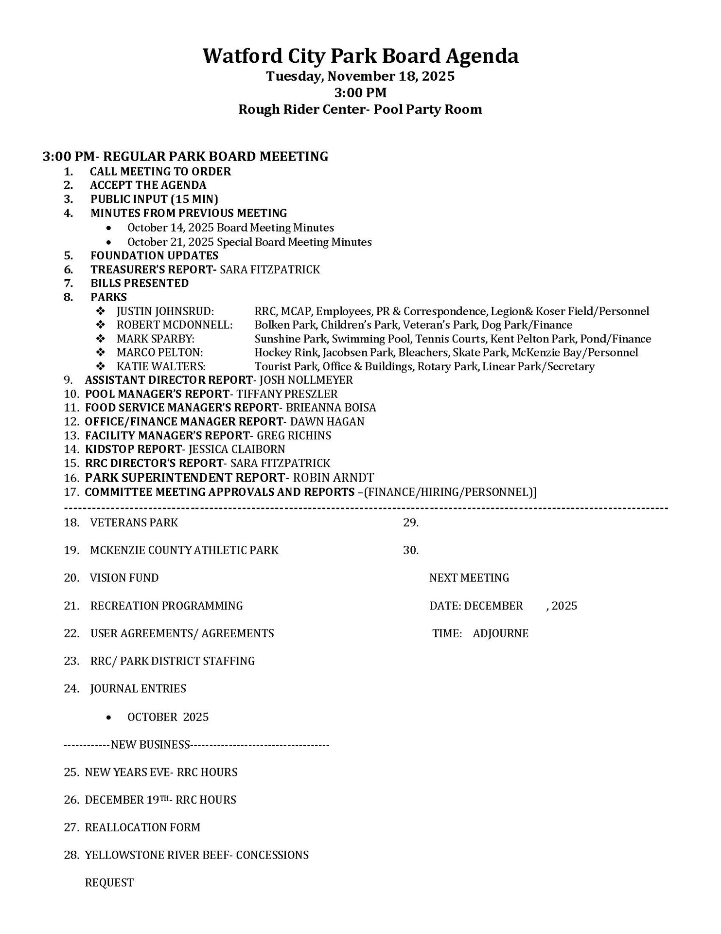 Next Watford City Park Board Meeting: November 18, 2025